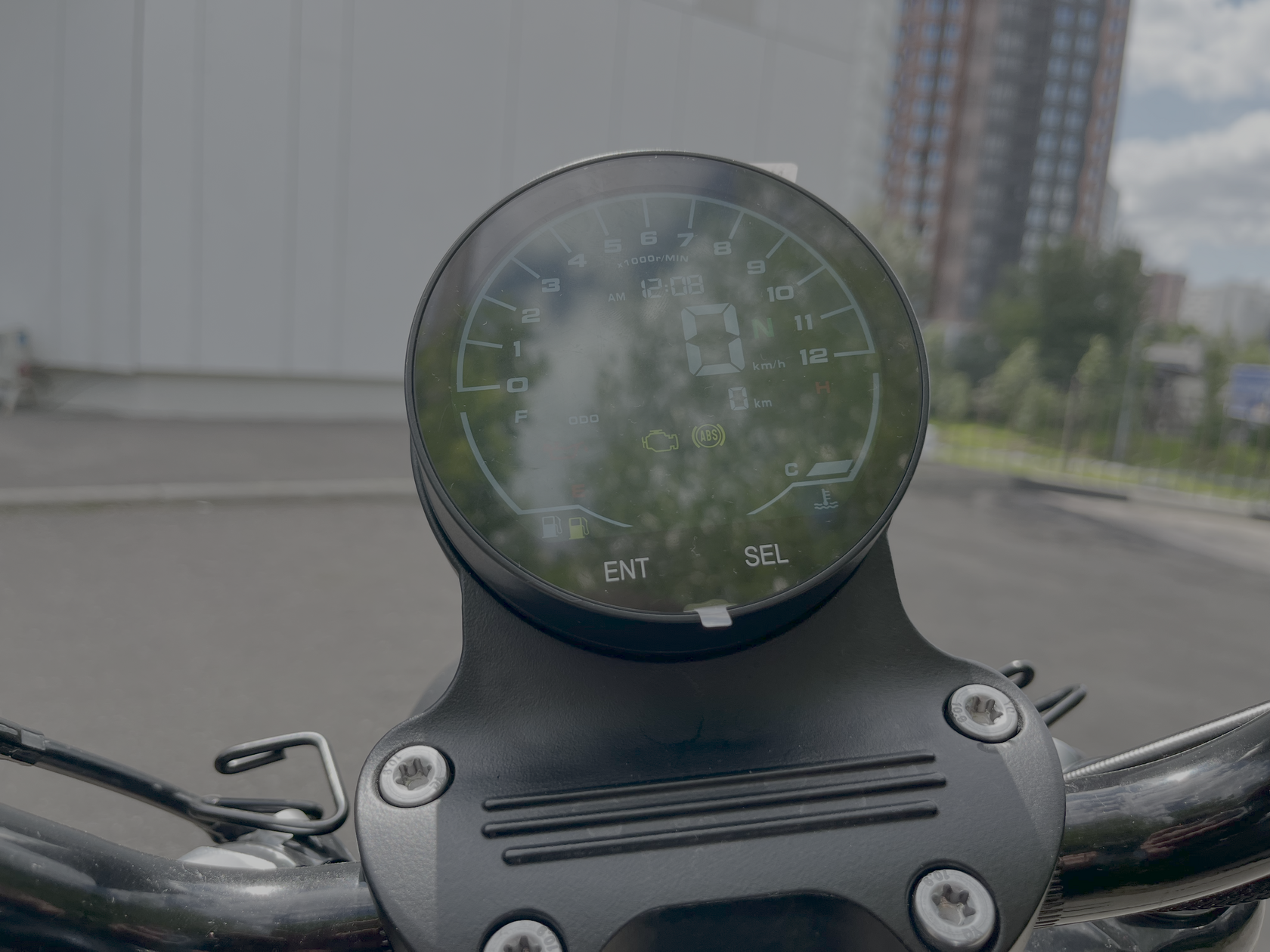 GROZA Toughman 800 – суровый и брутальный круизёр, который сразу обращает на себя внимание в потоке своей схожестью с кастом-байком: спартанской простотой с монохромной гаммой, олдскульными элементами, изящно оформленным двигателем, великолепной выхлопной системой и широченной задней покрышкой.Двухцилиндровый V-образный двигатель объёмом 800 см3 мощностью 61 л.с. при высоких показателях динамики и отличном крутящем моменте способен разгонять аппарат до 160 км/ч. Инжекторный впрыск топлива с инжектором DELPHI увеличивает топливную экономичность, а также позволяет добиться высокой приёмистости и неприхотливости агрегата. Привод на ведущее колесо осуществляется ремнём знаменитой марки USA Gates. Жидкостная система охлаждения не допустит перегрева мотора даже при самом агрессивном вождении.Аппарат имеет 6-ступенчатую механическую коробку передач с классической схемой “1-N-2-3-4-5-6”. На мотоцикл установлены литые алюминиевые диски диаметром 19 дюймов спереди и 17 дюймов сзади. Ширина передней покрышки – 130 мм, задней – целых 240 мм! С неровностями дороги эффективно справляются телескопическая вилка спереди и маятник с двумя газонаполненными амортизаторами сзади. Эффективное и безопасное замедление с любых скоростей обеспечивают гидравлические дисковые тормоза спереди и сзади.Байк обладает внушительным дорожным просветом 160 мм, что позволяет, при желании, съезжать на дороги с худшим покрытием, нежели асфальт. Зеркала не выходят за габариты руля, что позволяет комфортно проезжать на нём в междурядье.Мотоцикл сочетает в себе отличные технические характеристики, комфорт и надёжность, что позволяет вам ощутить настоящую свободу на любой дороге.