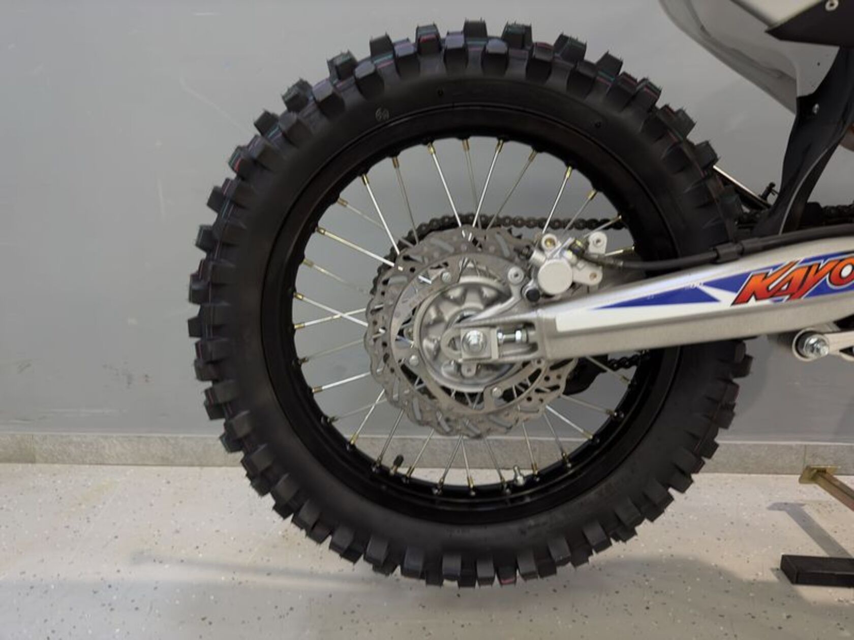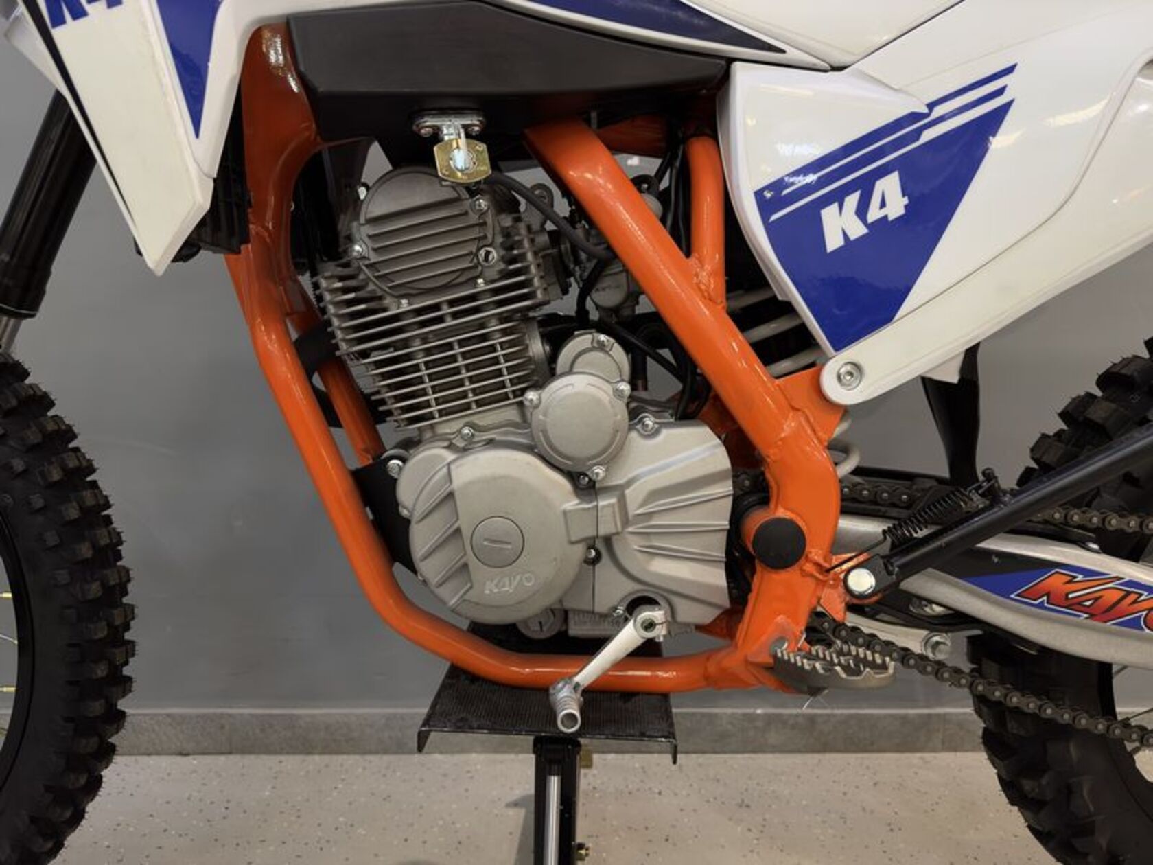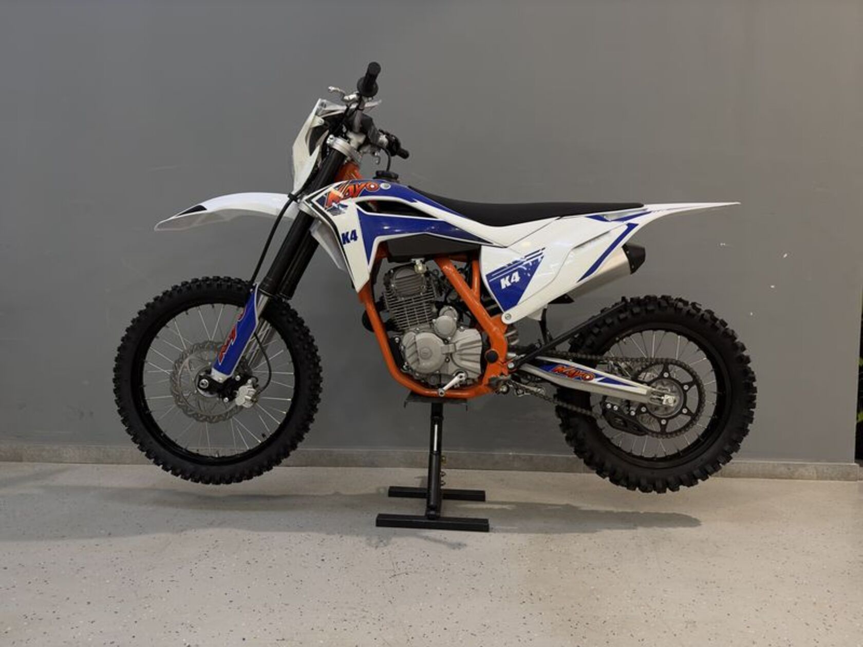 Мотоцикл кроссовый KAYO K4 MX - популярный внедорожный мотоцикл известного китайского производителя, завоевавший признание тысяч довольных владельцев. Обновленная версия отличается оптимально сбалансированной комплектацией и большими возможностями практического использования. KAYO K4 - это отличный выбор для райдеров с опытом, позволит совершенствовать навыки управления внедорожной мототехникой и получать весь спектр эмоций от поездок по бездорожью.В мощной раме KAYO K4 MX устанавливается надежный и неприхотливый 4-тактник воздушного охлаждения ZS172FMM с 5-ступенчатой коробкой передач. Этот мотор отличают отличная производительность и стабильные рабочие характеристики в широком диапазоне оборотов. Максимальная развиваемая мощность силовой установки, в тракте подготовки топлива которой задействован карбюратор NIBBI PE30, составляет 21 лошадиную силу.Подбор компонентов подвески мотоцикла продиктован условиями использования техники: длинноходные амортизаторы с регулировками рабочих характеристик установлены как в траверсах передней вилки перевернутого типа, так и на заднем маятнике с системой прогрессии. Алюминиевые диски колес размерности 21/18 дюймов оснащены буксаторами и комплектуются внедорожной резиной с выраженными грунтозацепами протектора.За безопасность эксплуатации отвечает надежная и производительная дисковая гидравлика тормозной системы: на переднем колесе установлен двухпоршневой тормозной суппорт, на заднем - однопоршневой. Высота по седлу KAYO K4 MX составляет 850 миллиметров - на байке с комфортом будут себя чувствовать как люди среднего роста, так и высокие райдеры.