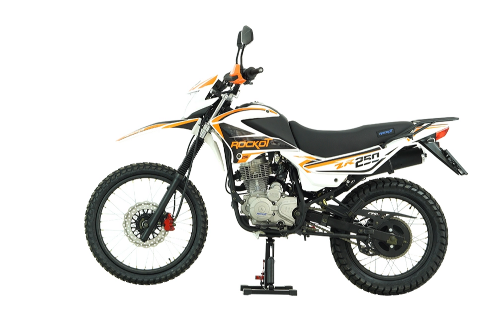 Представляем вашему вниманию новинку сезона 2024 года - бюджетный софт-эндуро мотоцикл ROCKOT ZR250.ZR250 - это полноценный эндуро мотоцикл с электронным ПТС, который был создан для повсеместной езды, будь то асфальтированные дороги общего пользования, грунтовые проселочные дороги и, конечно же, бездорожье. ROCKOT ZR250 выполнен по всем канонам софт-эндуро, а именно: прочный металлический бак, облицовка из мягкого ударопрочного пластика, широкое и комфортное сиденье для водителя и пассажира, а в задней части установлен стальной багажник. Мотоцикл производится в двух вариантах расцветки графики: черно-красной и черно-оранжевой.Дизайн мотоцикла ROCKOT ZR250 напоминает классический эндуро мотоцикл японского производства начала 2000-х годов. Именно эти байки послужили прообразом для создания бюджетного лайт-эндуро мотоцикла. Классическая вилка спереди, безлинковая подвеска сзади и колесная компоновка 21/18 - все это делает мотоцикл стильным, аутентичным, проходимым и доступным. ROCKOT ZR250 оснащен четырехтактным двигателем объемом 223 см³ и мощностью 16 лошадиных сил. Отличительная особенность этого двигателя от других “одноклассников” - это нижний распредвал и привод ГРМ штангами-толкателями. Данная конструкция двигателя является очень простой и надежной.Также, большим преимуществом газораспределительного механизма с приводом на толкателях, считается широкий диапазон крутящего момента во всех диапазонах вращения коленчатого вала.Система питания двигателя - карбюраторная, с высокопроизводительным карбюратором PZ30 с ускорительным насосом, который обеспечивает быстрый отклик на ручку газа, а также стабильную работу даже при холодном запуске. Обогатитель топливной смеси расположен на руле, что делает очень удобным первый запуск.Двигатель оснащен балансирным валом, снижающим уровень вибрации. Мотоцикл построен на прочной стальной раме, окрашенной в черный матовый цвет. Мотоцикл оборудован подножками для перевозки пассажира. Подрамник также выполнен из стали, к которому крепится металлический багажник, позволяющий перевозить грузы и установить центральный кофр. Подвеска ROCKOT ZR250 типична для данного класса мотоциклов - софт-эндуро. Это классическая вилка спереди, длиной 840 мм, и моноамортизатор, длиной 300 мм, сзади. Система рычагов прогрессии отсутствует, что облегчает эксплуатацию и обслуживание подвески мотоцикла. Несмотря на классическую простоту амортизаторов, они позволят комфортно ездить по бездорожью даже с пассажиром. Спереди и сзади установлена дисковая гидравлическая тормозная система. Передний тормозной диск увеличенного диаметра - 270 мм, который работает в паре с двухпоршневым суппортом. Задняя тормозная система имеет диск диаметром 240 мм и однопоршневой суппорт. Гидролиния тормозной системы состоит из армированных шлангов, которые обеспечивают наилучший отклик тормозной системы и повышенную надёжность всей системы. ROCKOT ZR250 с завода комплектуется универсальными туристическим шинами, позволяющими передвигаться по любому типу поверхностей. Передняя шина имеет размерность 90/90-21, а задняя - 120/90-18. Шины установлены на прочные стальные диски, окрашенные в черный матовый цвет.Привод на заднее колесо осуществляется цепью с шагом 520. Ведомая приводная звезда из стали насчитывает 45 зубьев. Кому подойдет эндуро мотоцикл ROCKOT ZR250Колесна