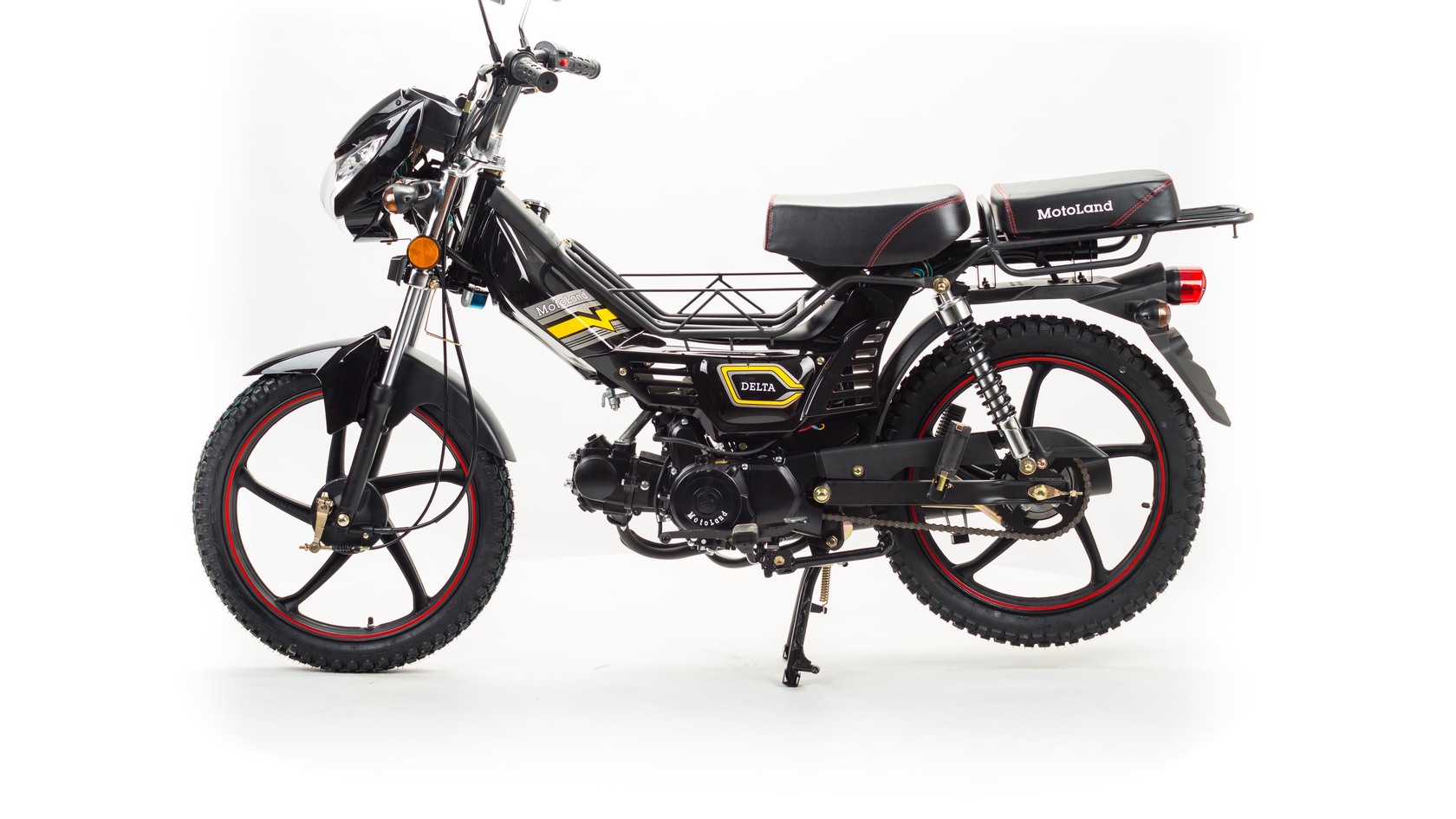 Мопед Motoland Дельта это всеми полюбившейся мопед который хорошо зарекомендовал себя на отечественном рынке. Выпускается в трех цветах: красный, синий, черныйМопед можно использовать для самых различных целей: для одиночного или совместного передвижения в городском потоке, сельской местности, поездки на природу, рыбалку и охотуПри этом он универсален и подходит мотолюбителям любого возраста,и опыта вождения.Для подростков, подойдет как подарок и первый мотоцикл для только начинающего свое знакомство с миром мототехникиВзрослых, которым нужна техника для поездок из точки А в точку Б и обратно, именно в таком режиме он способен показать себя с лучшей стороны.Мопед полностью отвечает требованиям к безопасному движению по городу и за городом: оснащен фарой дальнего и ближнего света, поворотниками, стоп-сигналом, звуковым сигналом, зеркалами заднего вида, габаритными светоотражателямиДля того чтобы ездить на мопеде, нет необходимости в регистрации в ГИБДД и страховке.Техническая сторонаМопед поставляется с 50 кубовым одноцилиндровым четырехтактным двигателем с воздушным охлаждением ZS50-A (1P39FMB).Установлен карбюратор PZ 19.Двигатель работает ровно, имеет высокую мощность в широком диапазоне оборотов, что позволяет комфортно трогаться и быть уверенным, что двигатель не заглохнет в неподходящий момент.Двигатель имеет возможность легкого запуска с кнопки на руле, так как имеет электростартер, а при необходимости можно воспользоваться кикстартером.Механическая трансмиссия содержит 4 передачиПри покупке мопеда, в подарок мы даем улучшенную поршневую.Мопед имеет хорошую динамику разгона, расход 1.6 л на 100 км, объем бака 3л, которого хватит на 200+кмПередняя подвеска телескопическая, с защитной гофрой.Задняя подвеска состоит из двух гидравлических амортизаторов, с прогрессивной пружинойВес мопеда 80 кг, выдерживает нагрузку до 150 кг.Колесные диски алюминиевые, размер колес — 17 дюймов (430 мм).Барабанные тормоза установлены на переднем и заднем колесе.На передней электромеханической приборной панели расположены спидометр,тахометр а также датчик включенной скорости