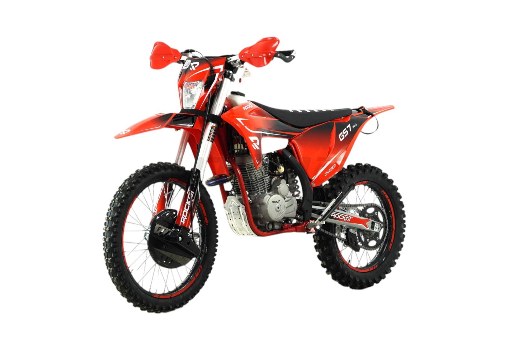 ROCKOT GS7 PRO Chaser - новинка в линейке мотоциклов GS от компании ROCKOT. Этот мотоцикл позиционируется как среднеразмерный эндуро высшего сегмента, о чем говорит его богатая комплектация. На сегодняшний день, это первый среднеразмерный эндуро, построенный на раме типа S6 в паре с современным и мощным двигателем LONCIN YB300H LX176FMN, а также более производительной подвеской, в сравнении с другими среднеразмерниками, и алюминиевыми дисками фирмы KKE.Исходя из названия модели - “Chaser”, что переводится как - охотник/преследователь, мы можем сказать, что его имя полностью оправдано дизайном, в котором выполнен данный мотоцикл. Здесь преобладает сочетание красного и черного цветов, что в графике плавно переходят в виде градиента. Рама мотоцикла окрашена в яркий красный цвет, а колесные диски в насыщенный черный, что делает образ мотоцикла ярким и контрастным. Элементы подвески и двигатель - серебристого цвета. Это позволило сделать мотоцикл более легким в его визуальном восприятии. Из множества других мотоциклов этого класса его выделяет облицовочный пластик, корни которого ведут к среднеразмерным кроссовым мотоциклам GASGAS. Фара головного света позаимствована от мотоциклов в стилистике KTM. Также стоит отметить множество элементов тюнинга, которые вписываются в концепцию и дизайн мотоцикла - “охотника” за наградами и призовыми местами в различных эндуро гонках.ROCKOT GS7 PRO Chaser оснащен самым современным двигателем Loncin YB300H LX176FMN мощностью 24,5 лошадиные силы и 18 Nm крутящего момента, который распределен “ровной полкой” от низкого до высокого диапазона оборотов коленвала. Диаметр цилиндра составляет 76 мм, а ход поршня - 63 мм. Двигатель отлично работает на топливе АИ-92/АИ-95 благодаря низкой степени сжатия - 9:1. Данный двигатель имеет четырехклапанную систему газораспределения и один распредвал, чем и достигается такая высокая мощность в паре с плоскодроссельным карбюратором PWK34. Выхлопная система выполнена из нержавеющей стали. Для повышения крутящего момента на низких оборотах, в приемную трубу встроен резонатор “PowerBomb”, имеющий обновленную форму. Пятиступенчатая коробка передач имеет специально подобранное для эндуро передаточное соотношение и корзину сцепления с семью дисками увеличенного размера. Все это говорит о прямом назначении данного двигателя для эндуро. Немаловажной частью в конструкции двигателя является балансирный вал, который гасит вибрации двигателя и делает тренировки на мотоцикле максимально комфортными. Также двигатель обладает системой фильтрации моторного масла со сменным масляным фильтром.ROCKOT GS7 PRO Chaser построен на раме S6, в основе которой лежит профессиональная рама S8 полноразмерных эндуро мотоциклов GS серии. Несущая часть рамы, расположенная в передней верхней части, имеет увеличенное сечение, как и сам корпус рулевой колонки, что увеличивает диапазон применения различных амортизаторов вплоть до 940/48. Передняя нижняя часть рамы выполнена в виде двух труб восьмигранного сечения. Данное конструкторское решение сделало раму более легкой, но при этом очень прочной. Боковая часть рамы состоит из плоских труб с шестигранным сечением. Геометрия рамы разрабатывалась специально для езды в дисциплине эндуро и по сей день оправдывает свое предназначение.Спереди установлена телескопическая вилка перевернутого типа с увеличен