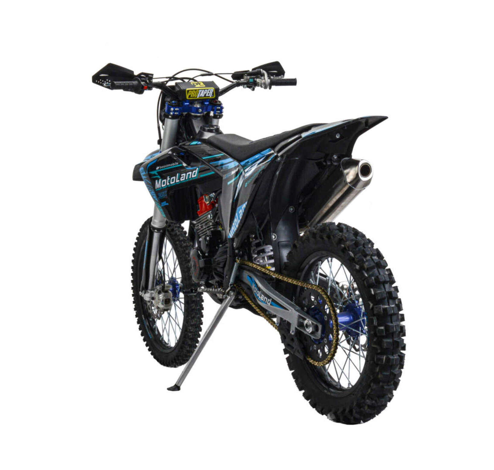Мотоцикл Motoland XT300 STНадёжная техника оснащенная двигателем 175FMM (PR5 4 клапана) с водяным охлаждением. с кикстартером и электростартером, Мощностью 26 Л.С. на двигателе установлен Карбюратор NIBBI n34 с ускорительным насосом.Это полноразмерный кроссовый мотоцикл его база по осям составляет 1400 мм., и габаритами 2100х800х1120 мм. Высота по седлу составляет 950 мм. Передние и задний амортизаторы с регулировками.За счет сбалансированной базы мотоцикл имеет отличную управляемость, а конструкция рамы и особенности настройки подвески GPX способствуют максимальному поглощению неровностей дорожного покрытия, а так же усиленная прогрессия на игольчатых подшипниках. Алюминиевые обода c антибуксаторами, усиленными спицами и ступицами.На кроссовой резине 80/100-21 / 110/100-18На мотоцикле установлена обновлённая тормозная система обеспечивающая отличные тормозные характеристики. Глушитель с уникальным дизайном прямоточного типа, полностью алюминиевый для облегчения веса.
