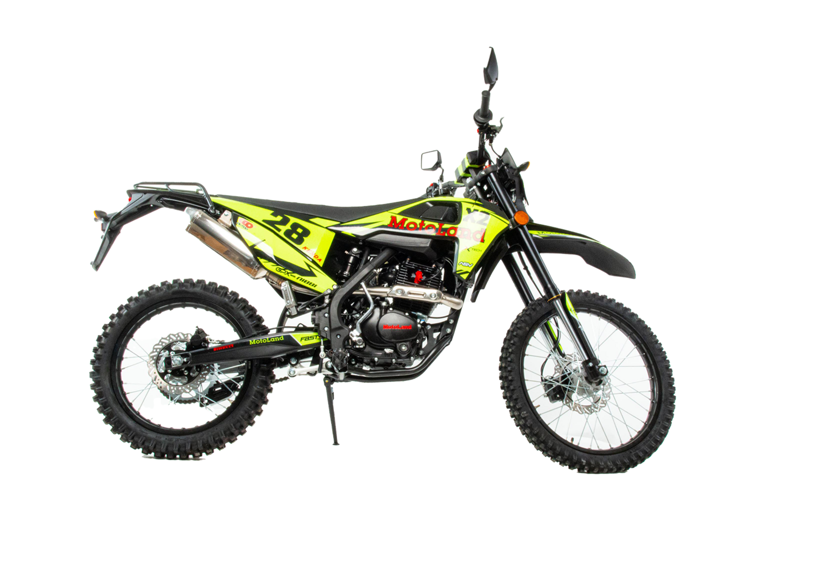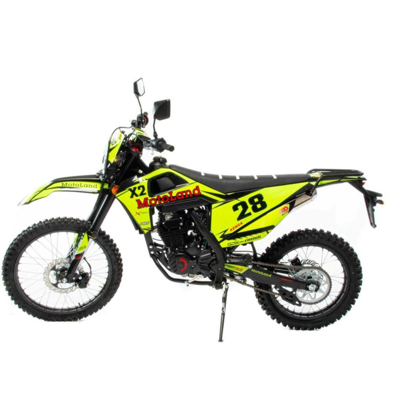 Мотоцикл Motoland X2 250 предназначен для езды по бездорожью и соревнований по мотокроссу. Имеет хорошую проходимость, прекрасно ведёт себя на песке и грунте, подходит для асфальтовых дорог. Оснащён двигателем 172FMM-3A мощностью 21 л.с. ,и карбюратором NIBBI PE 30.разгоняется до 120 км/ч. Выхлопная система из нерж. стали с резонатором "Рowerbomb", который увеличивает мощность на низких оборотах. Это одна из лучших моделей кроссовых мотоциклов по соотношению цены и качества.Подходит для новичков и любителей мотокросса. Идеален для бездорожья, его кроссовые шины (110-90) и (80-100) просто созданы для езды по мягкому и среднему грунту. Телескопическая вилка перевернутого типа позволяет легко преодолевать ямы, ухабы и другие неровности. Задняя подвеска маятниковая, с моноамортизатором.Мотоцикл доступен в ярком цвете "лайм" и отлично смотрится. Его дерзкий дизайн подчёркивает неуступчивый спортивный характер байка.Motoland X2 250 весит 120 кг, выдерживает нагрузку до 150 кг. Рама полудуплексная стальная. Прочный облицовочный пластик не ломается при сгибании, защищает от грязи. Надёжно закрепленный руль имеет переменное сечение: 28 мм в месте крепления и 22 мм на концах под грипсами, а также короткоходную ручку газа. Колёса на алюминиевых ободах, оснащены усиленными спицами и антибуксаторами, размер заднего колеса — 18 дюймов, переднего — 21 дюйм, а так же усиленными полыми осями.Для запуска двигателя можно использовать электростартёр или кикстартёр. Система зажигания электронная (CDI). Механическая трансмиссия содержит 5 передач. Отличный запас хода: объём топливного бака — 6 л, расход топлива — 5 л на 100 км. Передняя фара светодиодная, обновленного дизайна, легко включается поворотом замка зажигания и позволяет ездить в сумерках и темноте.Так же мотоцикл оснащён надёжными передними двухпоршневым тормозным суппортом и задними тормозами с однопоршневым тормозным суппортом, задним багажником, приборной панелью, поворотниками и зеркалами. Удлиненное сиденье, с антискользящим покрытием. Тормозные диски крепятся на 4 болтах, диаметр заднего тормозного диска 215 мм, переднего — 235 мм. Тормозной шланг армированный.