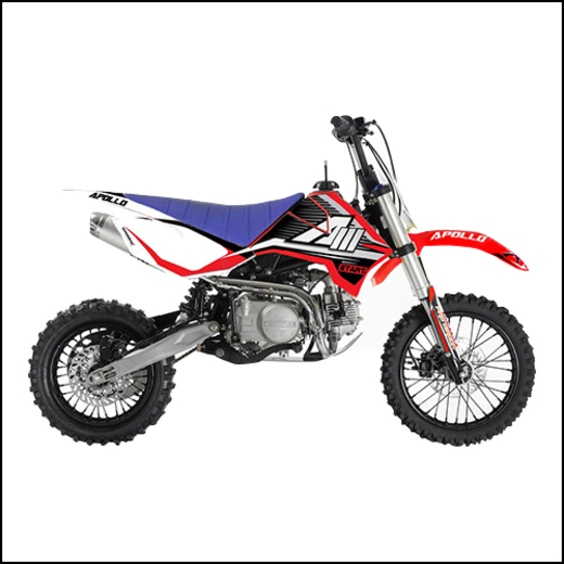 Питбайки компании Apollo родом из Франции. Головной офис компании расположен в Париже. Идеология, заложенная в бренд, носит спортивный характер. Улучшение “породы” происходит в гонках.Модели Apollo RXF (17/14) безошибочно узнаваемы благодаря хребтовой раме с V образным профилем боковой проекции начинающейся от точки крепления маятника под углом 45 градусов. Геометрия рамы была переработана и полностью учитывает размерность применяемых колес, а расстояние от подножек до седла одно из самых больших, что в свою очередь благотворно влияет на езду в стойке.Подвески питов оснащаются вилками и амортизаторами volt, топовые модели имеют регулировки по отбою. На всех моделях установлены двигатели YX, с объемами: 125, 140 и 150 см3 (последний с разными типами ГБЦ) Так же в модельном ряде появился самый кубатурный мотор ZongSheng 190 см3, оснащенный 5 ступенчатой КПП и электростартером.Хочется отметить, что компания Apollo в линейки RXF, закончило полноценную интеграцию и оптимизацию моделей под “большие колеса”. Это можно заметить при взгляде на питбайки в боковой проекции. Расстояние между баком и рулевой колонкой потеряло “зазор”, причина которого крылась в наращивание переднего треугольника под 17 колесо. Сейчас это пространство полноценно поглотил бак, который в свою очередь увеличил объем с 4,7 литров до внушительных 6,5 л. Полностью новый пластик оптимизирован под пропорции “выросшего питбайка”, сиденье стало тоньше и изящнее, боковые щитки увеличены в размерах, глубокий разрез по боковой линии подчеркивает раму, удлиненное заднее крыло и полностью новое передние, не оставляют шансов грязи. Тормозные диски получили пластиковую защиту, амортизатор брызговик, а карбюратор фильтрбокс. Продуманность компоновки питбайка выгодно отличает данную марку от других брендов.Проделанная работа позволила вернуть визуальную целостность модели, которой обладала вся серия Apollo на колесах 14/12.
