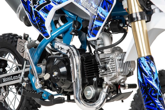 Питбайк Motoland TCX125 14/12 идеален для поездок по грунтовым дорогам и бездорожью. Хорошо чувствует себя на мягком и среднем грунте, разгоняется до 90 км/ч. Оснащён спортивными траверсами, весит всего 70 кг.Питбайк прост в управлении и не требует специального ухода, подойдёт как новичкам, так и любителям мотокросса.Питбайка отличный узнаваемый дизайн. Конструкция подчёркивает неуступчивый спортивный характер, который не остановится ни перед одним препятствием.Комбинированный прочный пластик не ломается при сгибании.Передняя подвеска — телескопическая вилка перевёрнутого типа (с регулировкой по давлению воздуха), которая отлично подходит для преодоления ям, и других неровностей плохих дорог или их отсутствия. Задняя подвеска маятниковая с моноамортизатором.Мотоцикл оснащён одноцилиндровым четырёхтактным двигателем с воздушным охлаждением. Надёжный мотор 152FMI мощностью 8 л. с. и объемом 125 см³ , установленный на усиленной стальной раме, коробка передач автоматическая, четырёхступенчатая
