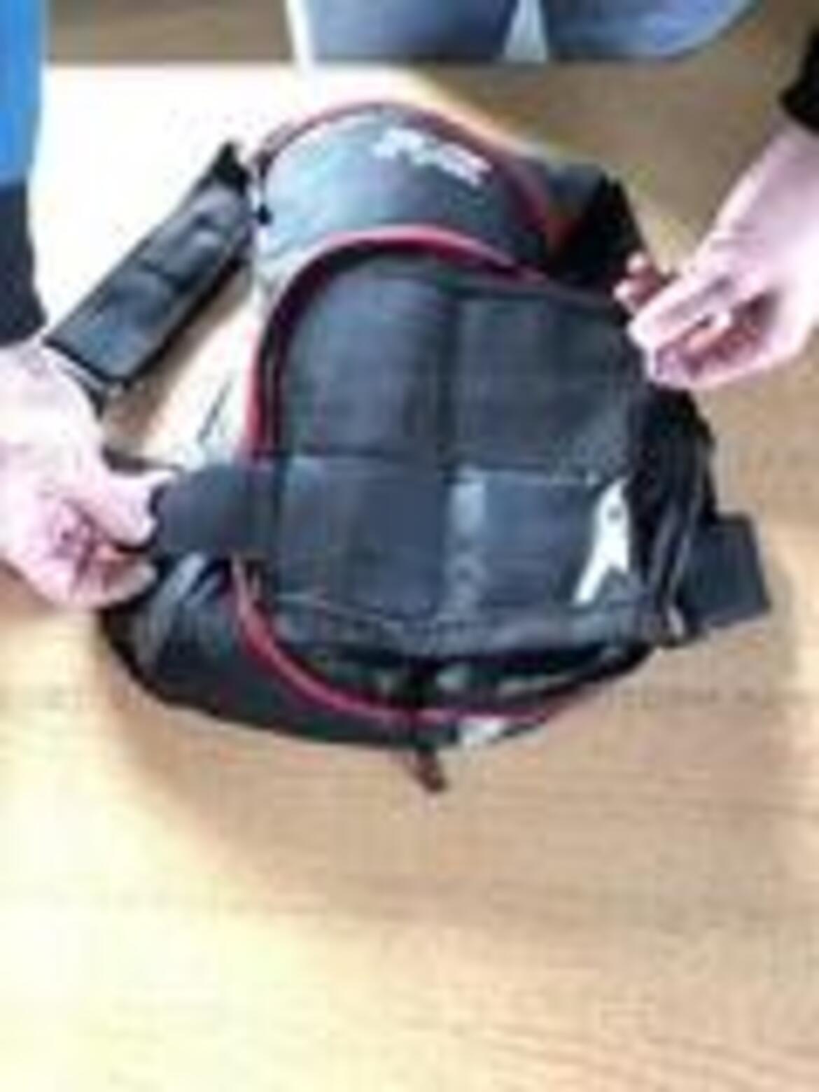 материал водонепроницаемый, плотный нейлон;2-литровый резервуар воды с изолированной трубкой и клапаном подачи жидкости;изолированный резервуар для воды;размеры: длина 36 см, ширина 21 см, глубина меняется от 8 до 12 см; сетка задней панели рюкзака добавляет комфорта и фильтрует влагу;светоотражающие полосы для дополнительной безопасности; цвет: черный-красный.